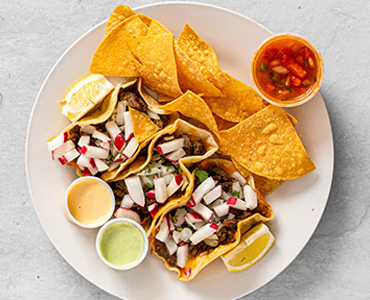 Corn tortillas with protein, onion and cilantro, shredded cheese, lime and house sauce, and pico de gallo and chips accompanied