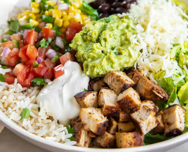 BowlServed with cilantro-lime rice, black beans, protein, pico de gallo, shredded cheese, sour cream, medium-hot salsa, and romaine lettuce.