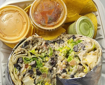 Burrito with flour tortilla, rice, black beans, protein, shredded cheese, sour cream, pico de gallo, medium-spicy sauce, and romaine lettuce