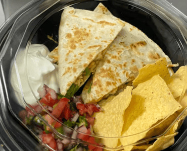 quesadillas with flour tortilla, shredded cheese, protein of your choice, grilled vegetables, sour cream, chips and pico de gallo on the side