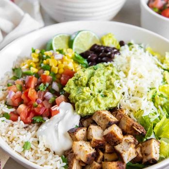 BowlServed with cilantro-lime rice, black beans, protein, pico de gallo, shredded cheese, sour cream, medium-hot salsa, and romaine lettuce.