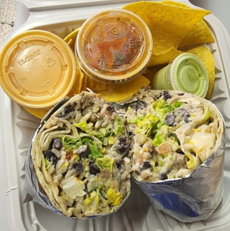 Burrito with flour tortilla, rice, black beans, protein, shredded cheese, sour cream, pico de gallo, medium-spicy sauce, and romaine lettuce