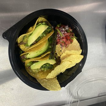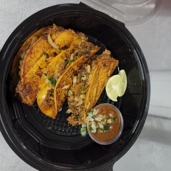 Corn tortillas with protein, onion and cilantro, shredded cheese, lime and house sauce, and pico de gallo and chips accompanied