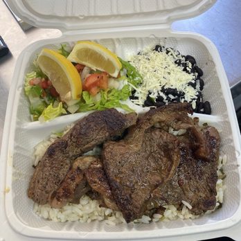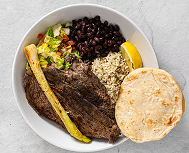 Carne asada con arroz y frijoles negros lechuga pico de gallo y cebolla al grill y queso seco rallado y dos tortillas