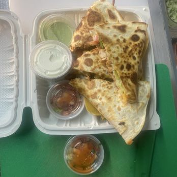 quesadillas with flour tortilla, shredded cheese, protein of your choice, grilled vegetables, sour cream, chips and pico de gallo on the side