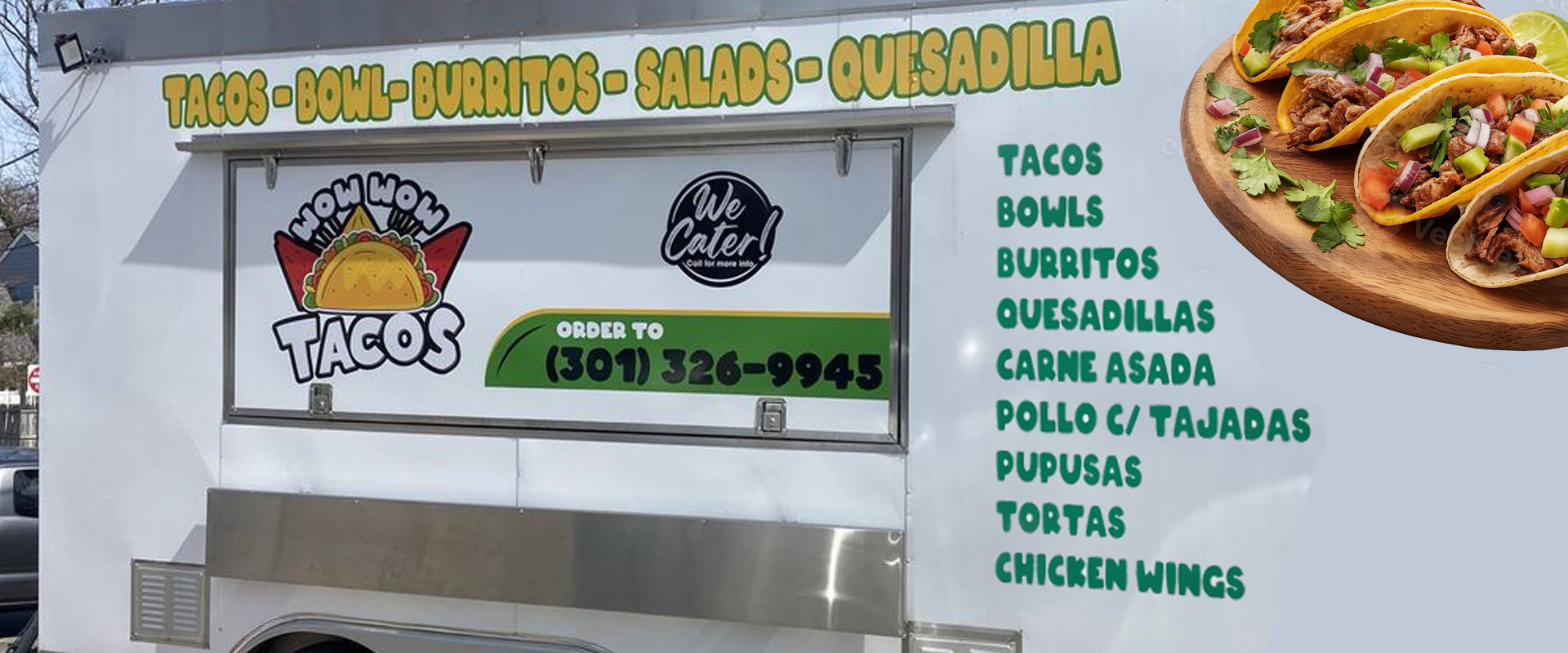 Wow Wow Tacos is a lively food-truck concept blending Latin and American flavors. Based in Silver Spring, MD, it serves made-to-order tacos, burritos, bowls, quesadillas, nachos, and other favorites like wings, steak & cheese, and pupusas.